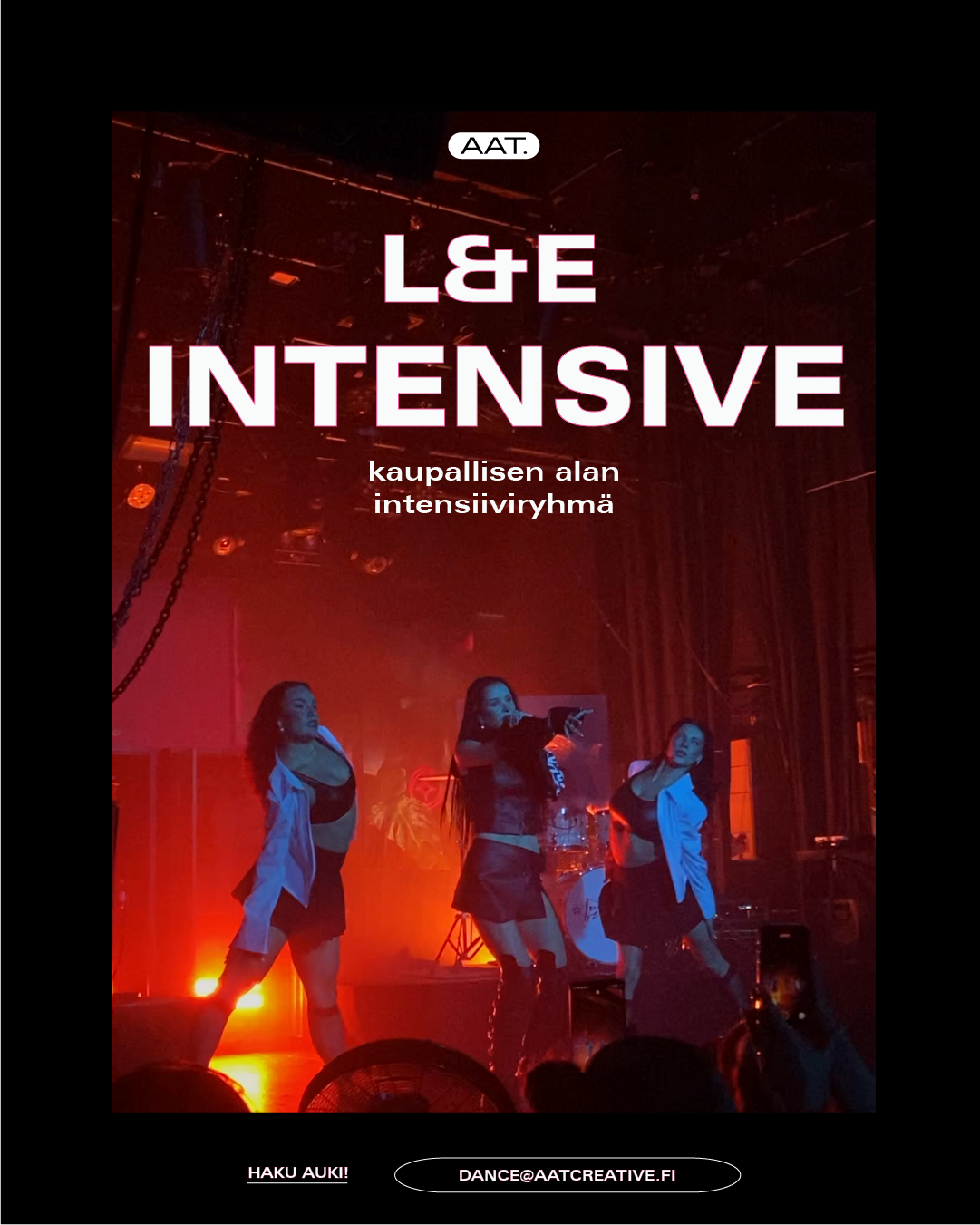 Haemme ensi vuodelle 2026 molempiin intensiiviryhmiin muutamia uusia tavoitteellisia, motivoituneita, sekä vahvan tanssipohjan omaavia tanssijoita. Ryhmän pääpaino on commercial-tyylissä, mutta ryhmä treenaa myös jazzia, nykytanssia ja heelsiä, eli kaikkia niitä taitoja, joita kaupallisella kentällä usein edellytetään.